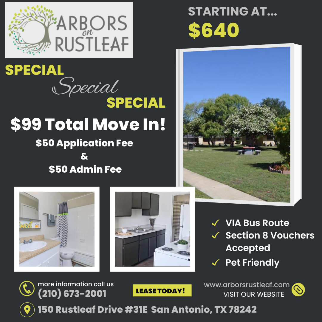 Arbors on Rustleaf apartments in San Antonio, Texas, welcomes you home. We are in an excellent location across from Lackland Air Force Base. With close proximity to shopping and dining, there is a wide array of exciting things to do. With easy access to the VIA Bus route, getting where you need to go is easy and convenient. Check out the Neighborhood page and discover what surrounds this amazing community!
